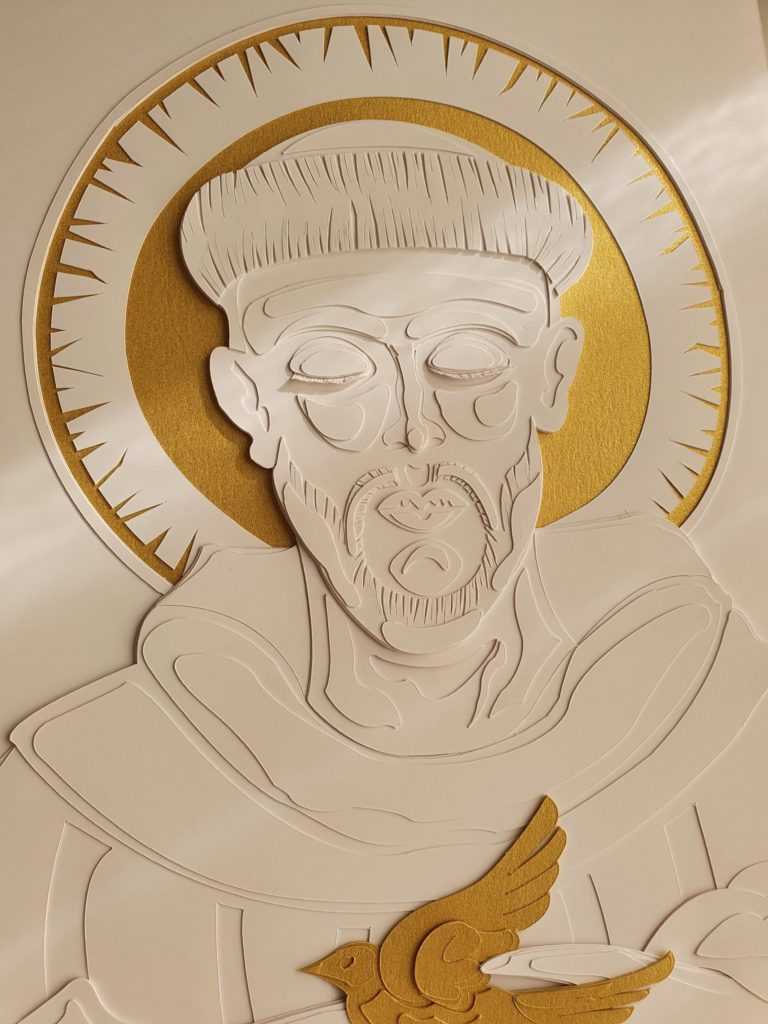 Talita Tiemi é a criadora da técnica denominada “Máscara de Dobras” — uma abordagem artística autoral que se destaca pela composição de triângulos incompletos delicadamente colados sobre a superfície do papel. Essa técnica inédita, confere tridimensionalidade, movimento e profundidade às obras, tornando cada criação verdadeiramente singular.