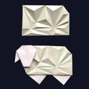 Dentre as minhas pesquisas me deparei com um artista de Istanbul, da Paperpan Artworks, que foi minha primeira inspiração para o desenvolvimento do meu estilo de trabalho. Comprei alguns papéis, mesmo sem conhecer técnicas e sem nenhum curso e desenvolvi meu primeiro trabalho, uma ovelha que misturava o origami e os triângulos da Paperpan.